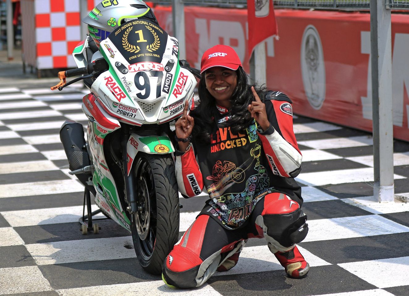 First and the only woman racer so far, to race & finish in the top 5 in the Stock upto 165cc Novice category at the Indian National Motorcycle Racing Championship among 40 boys.